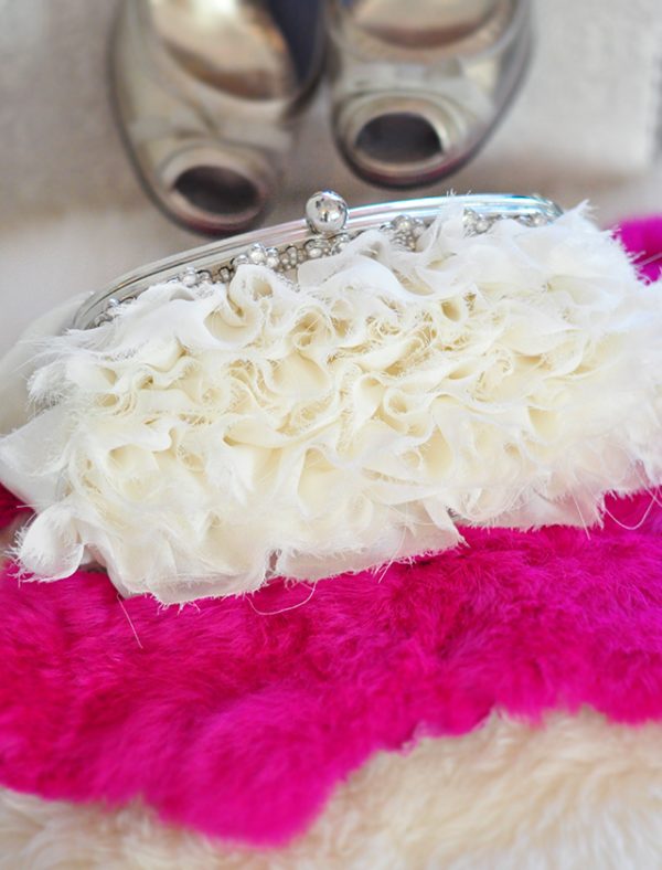 Okay Lovecats, I’ve had this idea to DIY a pretty ruffled wedding clutch bag AND to give it away to one lucky bride, FOR-LIKE-EVER, but had the hardest time finding the perfect little base clutch from which to work with. But finally, a few months ago, I found it… and it’s perfect. It’s pretty but …