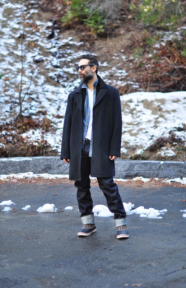 What He’s Wearing… * White v-neck by Calvin Klein Underwear * Chambray shirt by Coast-Wide * Retro slim fit straight jeans by Citizens of Humanity * Winter overcoat by Our Legacy * Slip on duck boots by Crocs {which they no longer make} * Sunglasses by Opening Ceremony {by S/O} Similar by Oliver Peoples West …