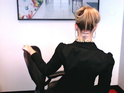 I took the time to straighten my hair this morning …well, it was really already straight but I wanted to give it an angular look. After I finished and got dressed, it just felt greasy to me so at the last minute I put it up. I would have even preferred a high pony tail but it was too heavy and pulling my head back. Blerg.