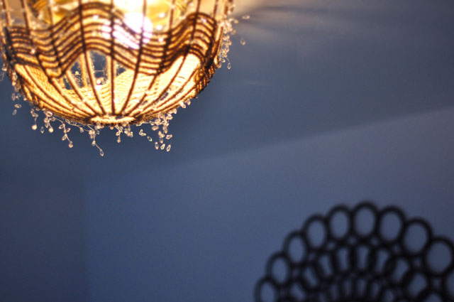 Though it’s not completely “nautical”, even with the rope, I’m pretty excited about the way it turned out. When the light is on, it reminds me of the sun, shooting rays out across the ceiling, which gives it a warm Summery, beachy feel. The crystals just add a little texture and sparkle and make it a little more whimsical and romantic, which is always nice for guests, don’t you think? It’s fun when you can see it in the room, as part of a whole. I may create another one, in a completely different way, and with different materials, for another room upstairs. My total cost for this was about $20, compared to the price of new fixtures I’d have to rewire, I think it’s the best option for so many spaces. Imagine all the materials you could use?